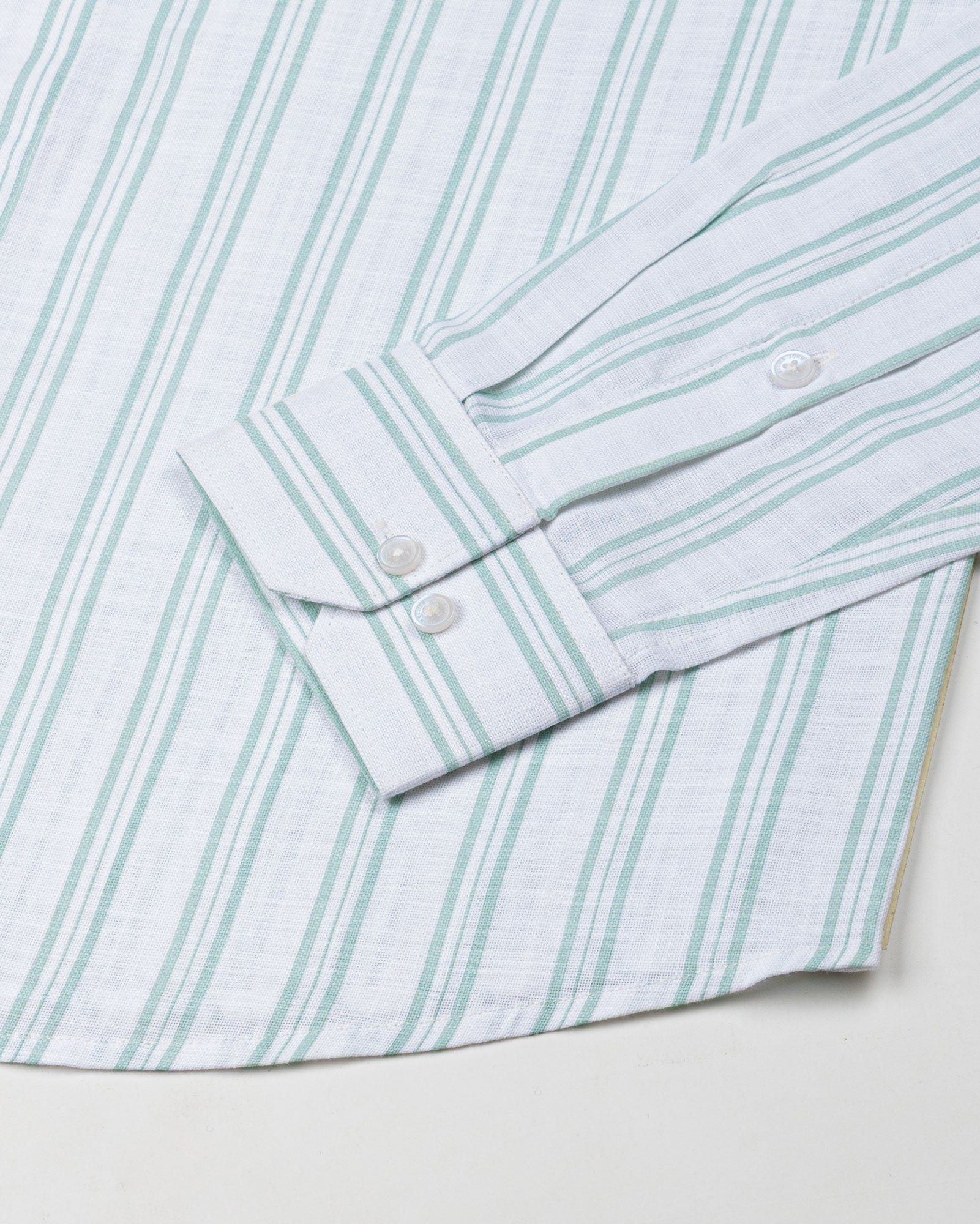 This shirt features refined vertical olive stripes on a clean, light base, creating a look that feels balanced and composed. The classic collar and neatly structured cuffs keep the silhouette sharp, while subtle detailing adds quiet depth, giving the shirt an effortless, confident presence.