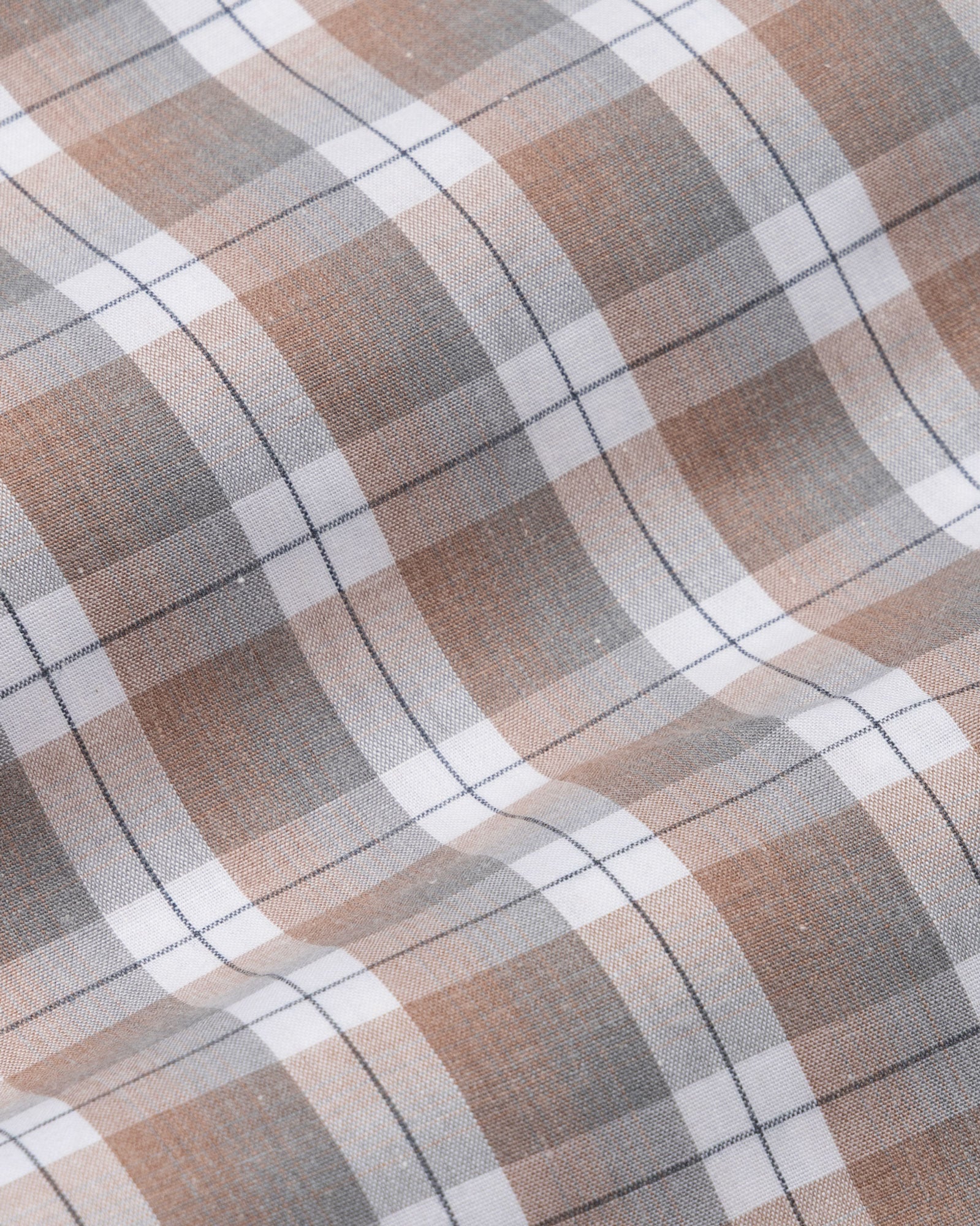 Crafted from cotton, the fabric feels smooth and breathable, ensuring comfort through long hours of wear. Its fine weave enhances the depth of the checks while maintaining a crisp finish that holds its shape and refined appeal throughout the day.