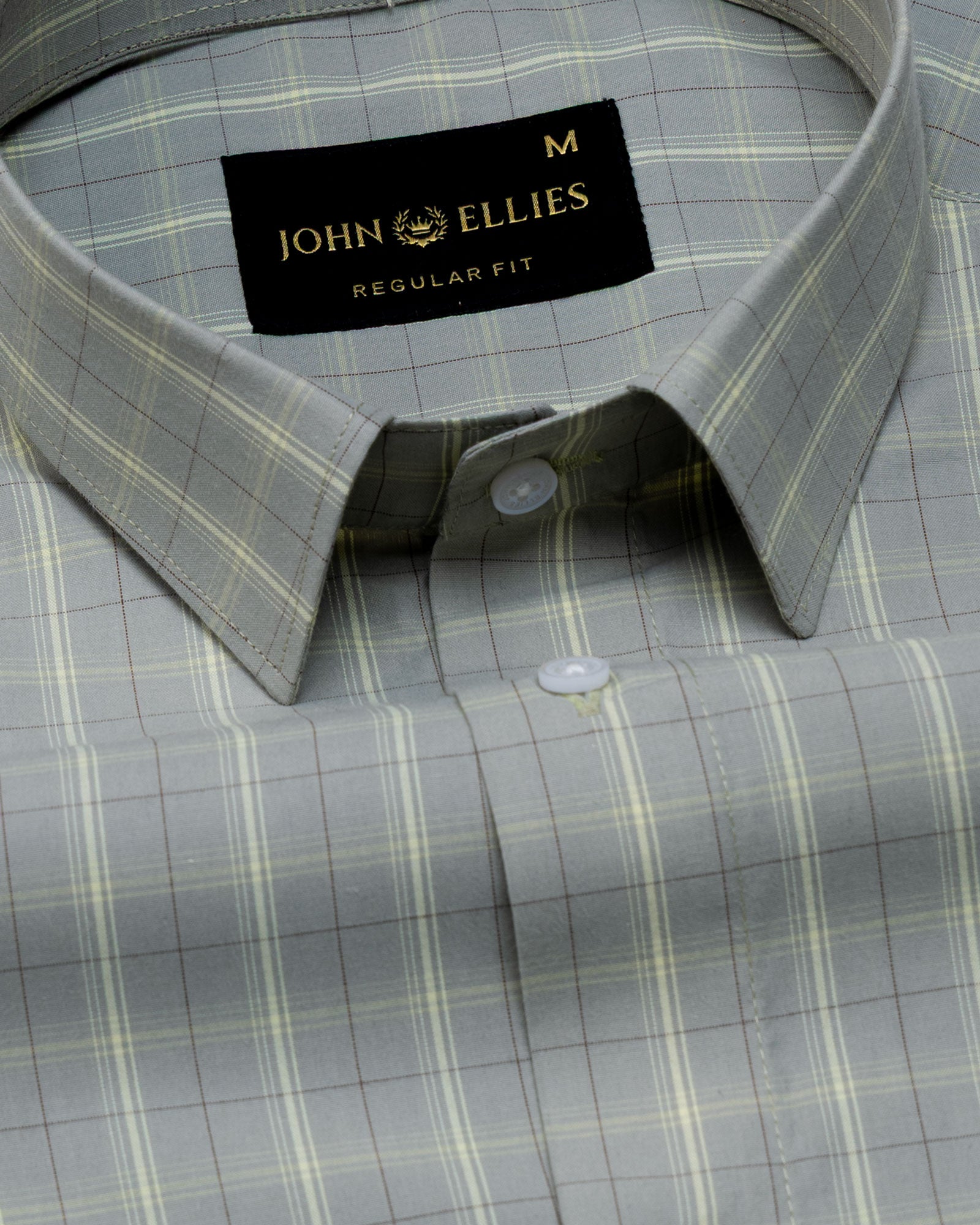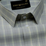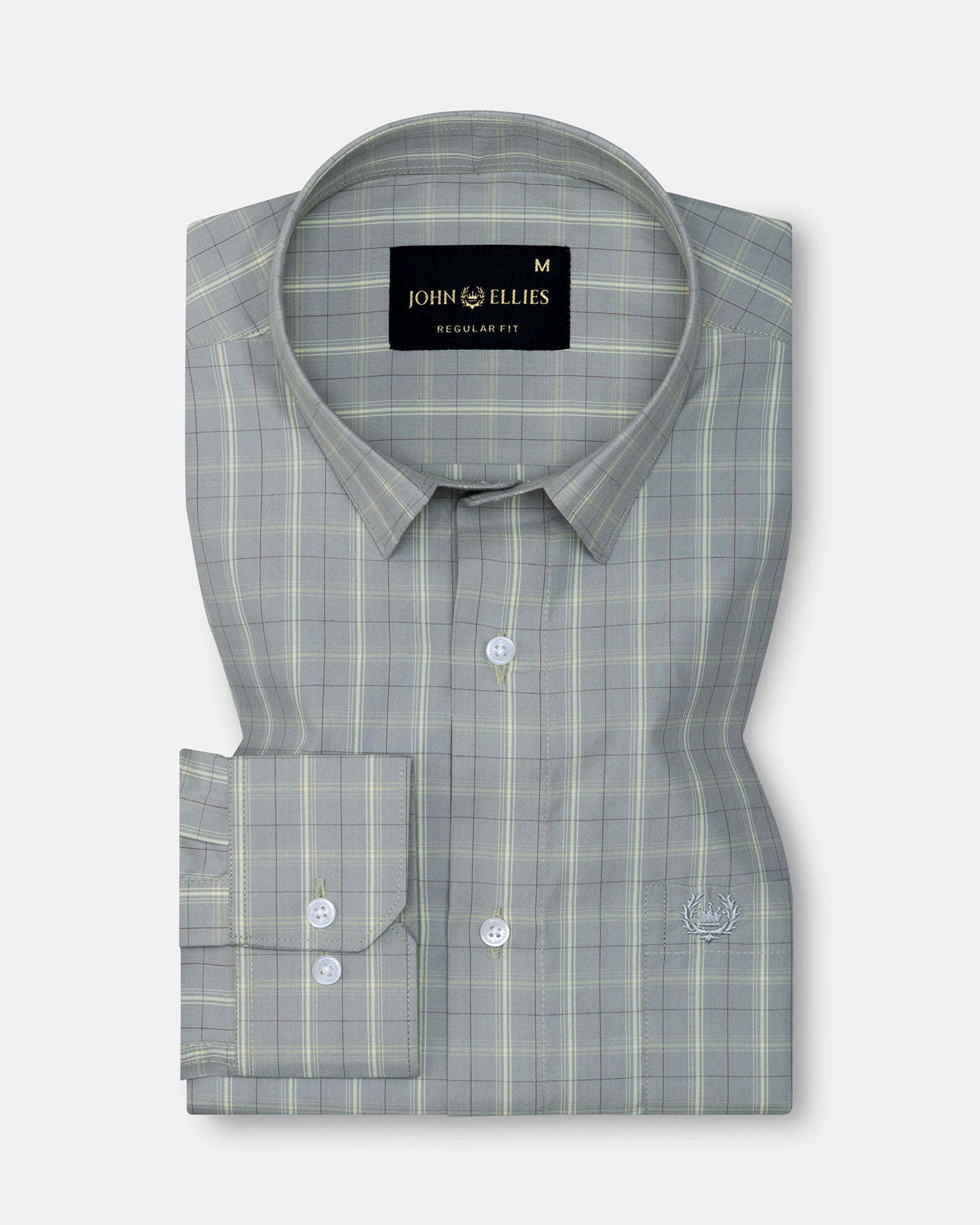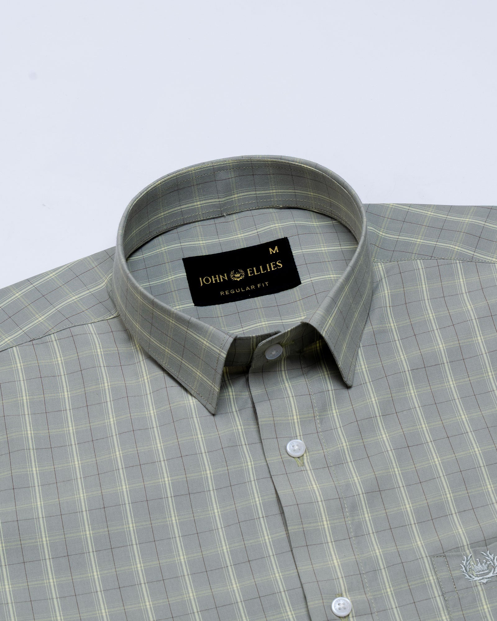 A sophisticated check shirt designed with a classic regular collar that maintains a sharp and balanced silhouette. The muted sage grey base is layered with soft windowpane checks in subtle tones, creating a refined pattern that feels elegant yet understated. Finished with tonal buttons, a clean front placket, structured cuffs, and the signature embroidered crest that adds a discreet touch of character.