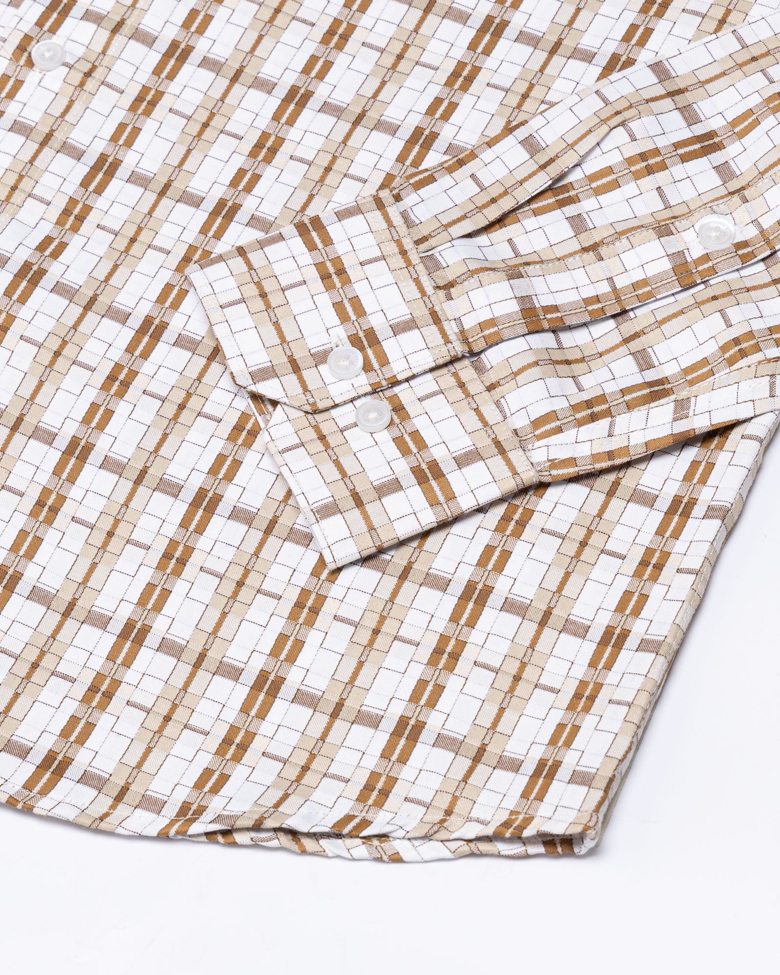 A distinctive check shirt designed with a classic regular collar that keeps the look sharp and well-balanced. The white base is layered with warm brown and beige intersecting lines, creating a textured plaid-style pattern that adds depth and visual interest. Finished with tonal buttons, a clean front placket, structured cuffs, and the signature embroidered crest that completes the shirt with a refined identity.