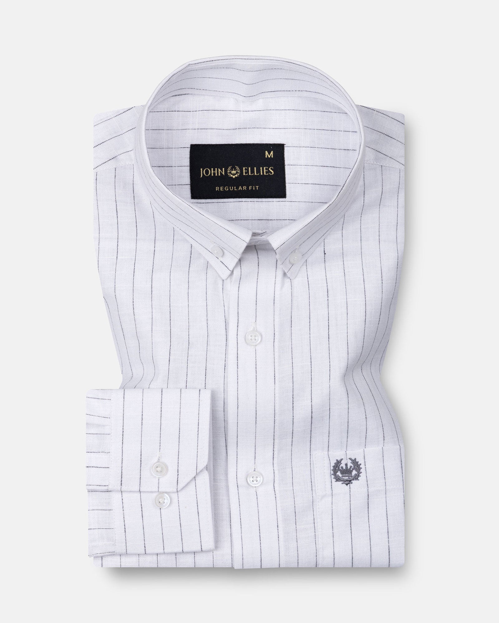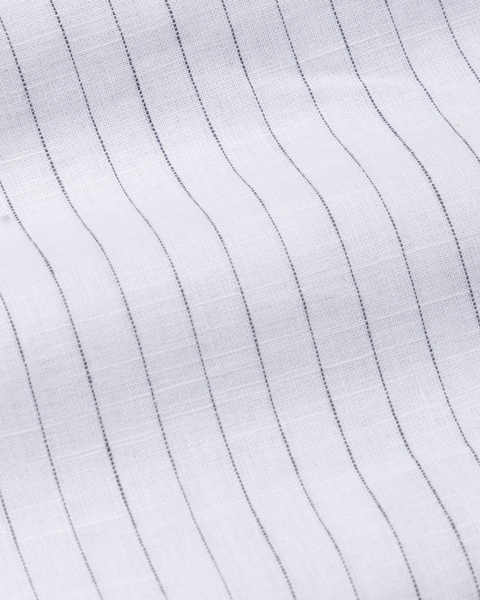 This button-down striped linen shirt brings effortless sophistication to everyday dressing. The fine black vertical stripes over a clean white base create a sharp, elongated look, while the structured button-down collar maintains a polished silhouette. Detailed with matching light-tone buttons, a neatly finished placket, and a subtle embroidered chest logo.