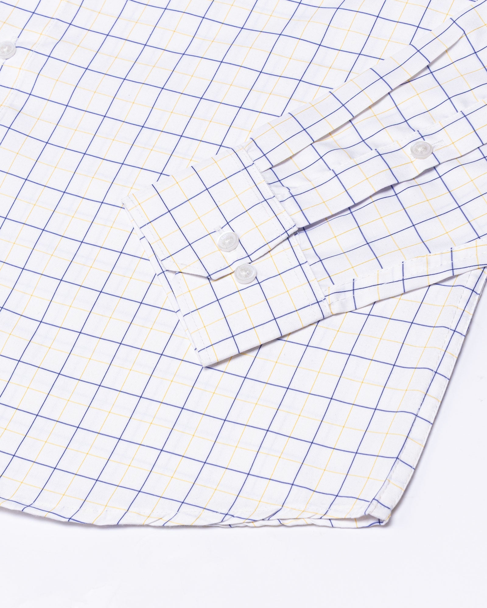 a crisp check shirt designed with a white base and fine blue and yellow windowpane checks that give the shirt a clean, balanced character. the button-down collar keeps the look structured yet relaxed, making it suitable for both office wear and smart casual occasions. finished with a neat front placket, classic cuffs, and the signature embroidered crest that adds a refined finishing touch.