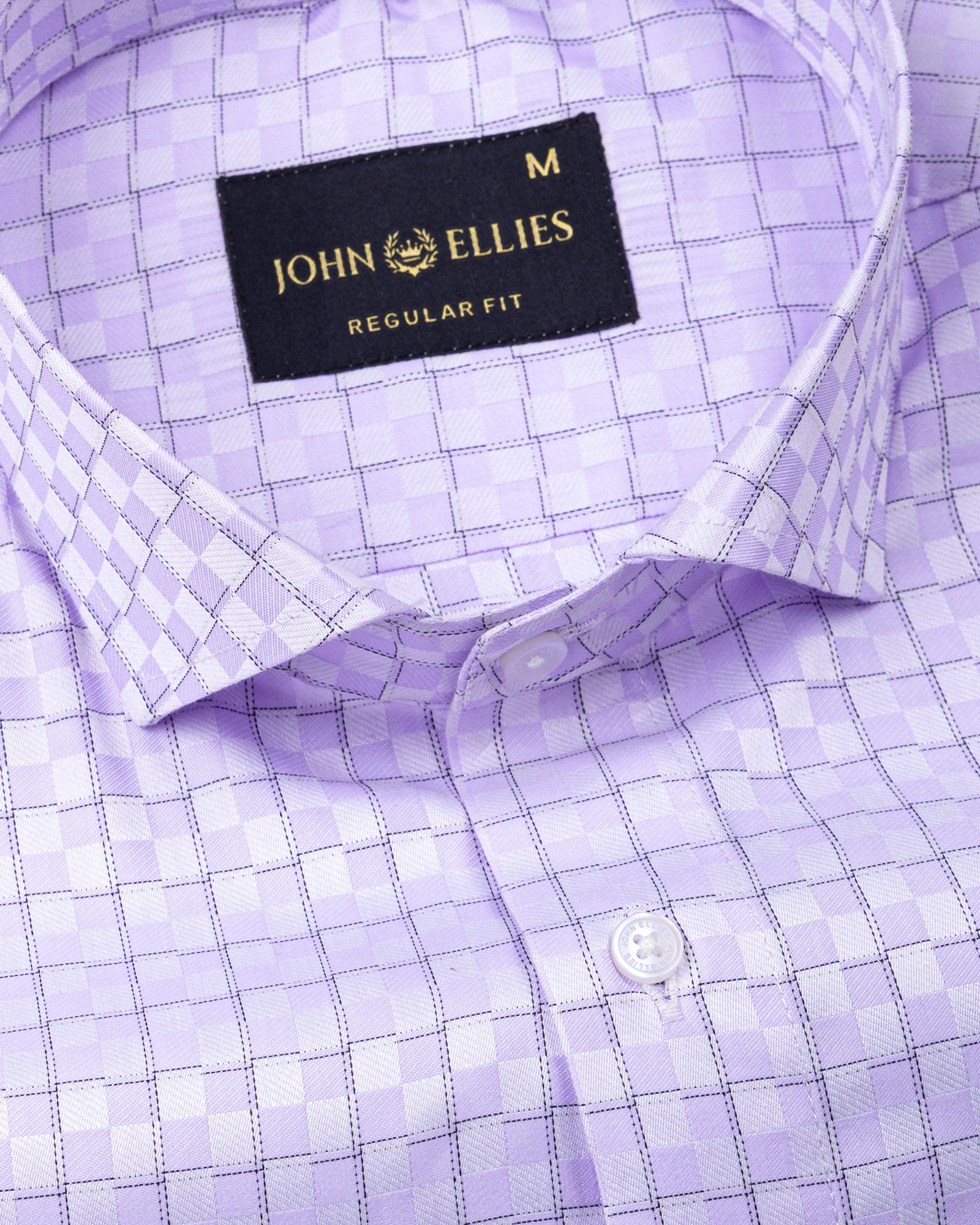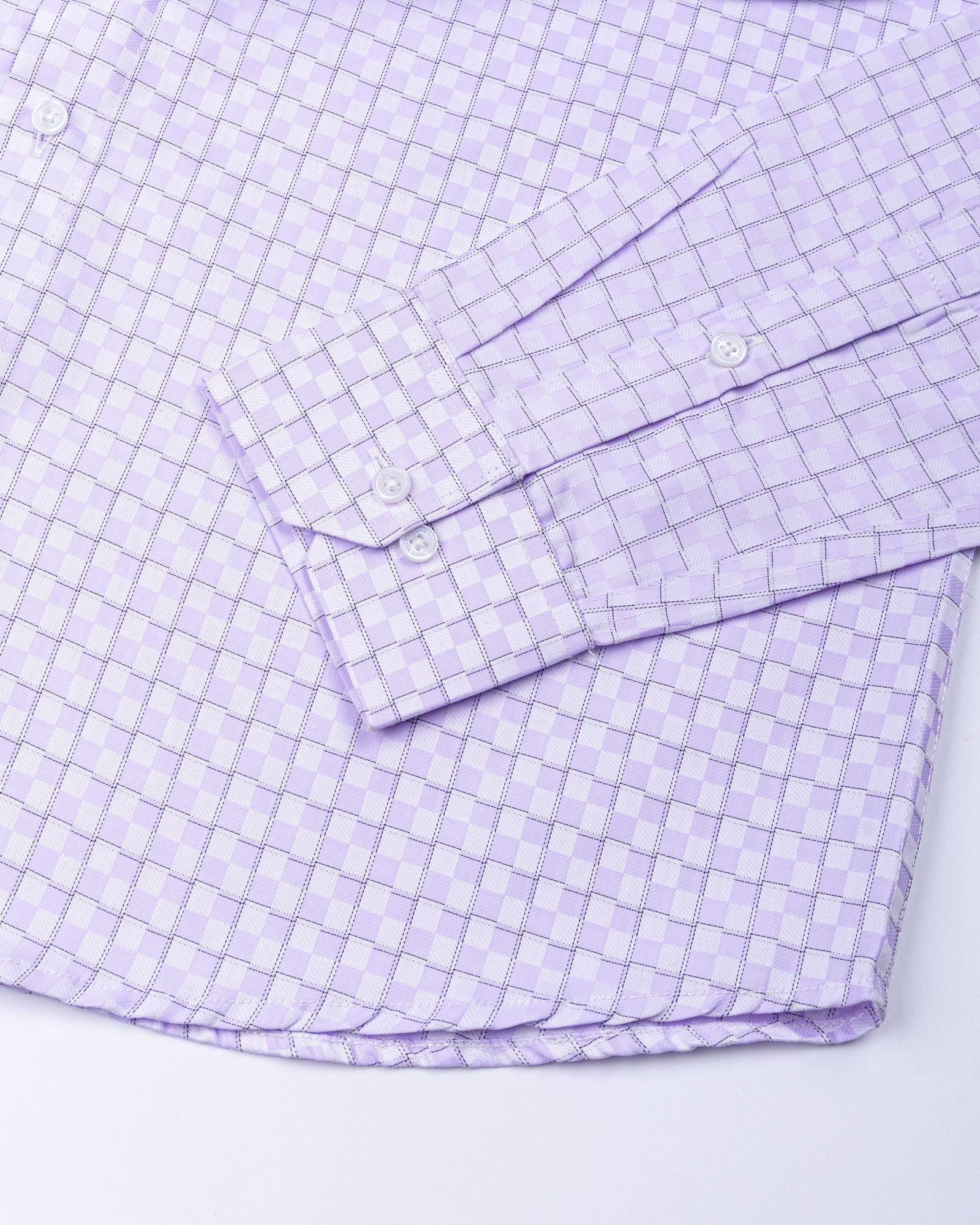 A sophisticated lavender shirt tailored with a sharp cutaway collar that enhances its modern silhouette. The subtle check pattern is elevated with a textured cotton weave, giving the fabric depth and character. Designed in a regular fit with matching buttons and precisely finished cuffs.