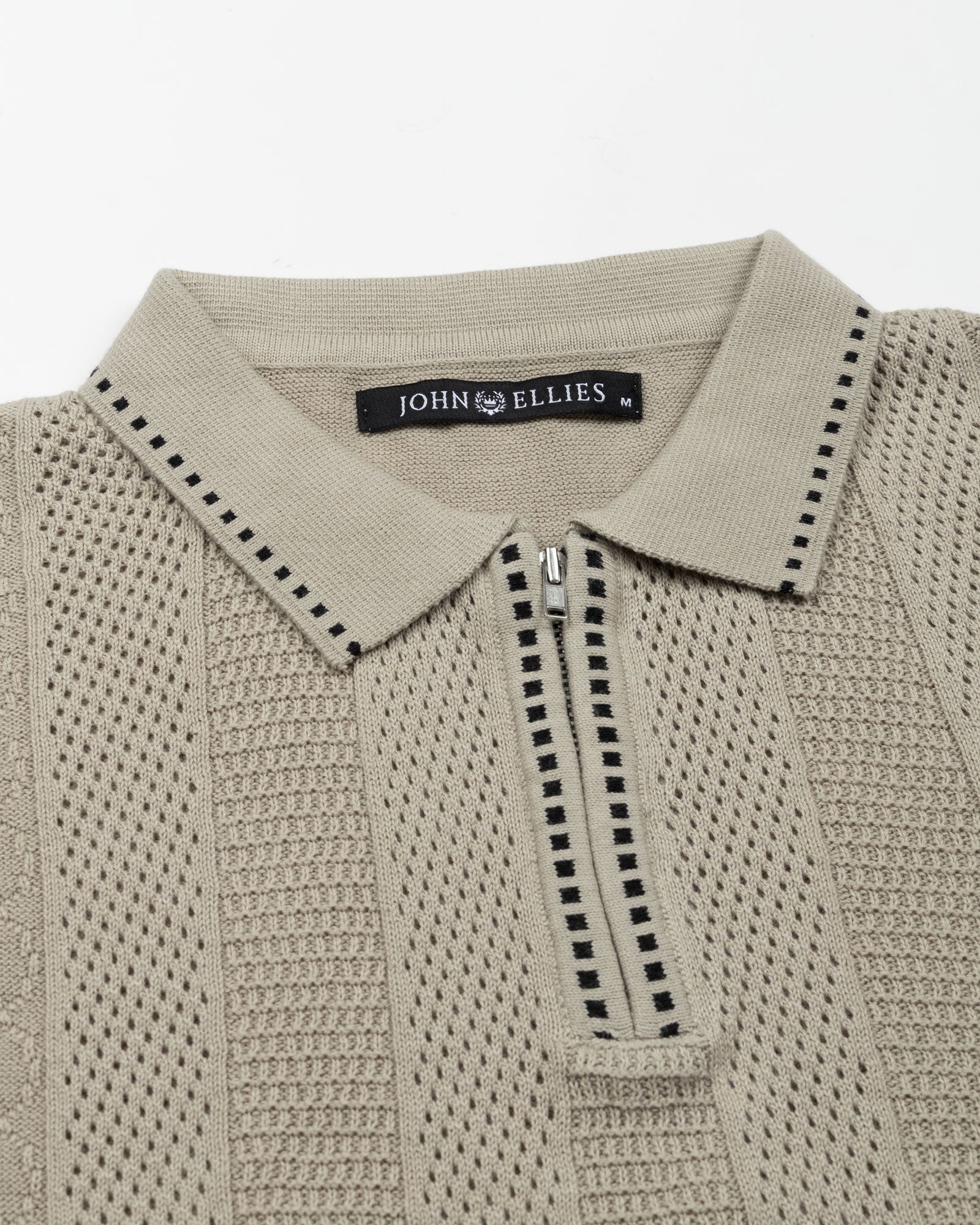 A refined knitted polo crafted with a structured check texture and a smooth half-zip closure. The contrast-tipped collar elevates its clean silhouette, while the soft, stretch-knit construction ensures premium comfort and a modern, sophisticated presence for any setting.