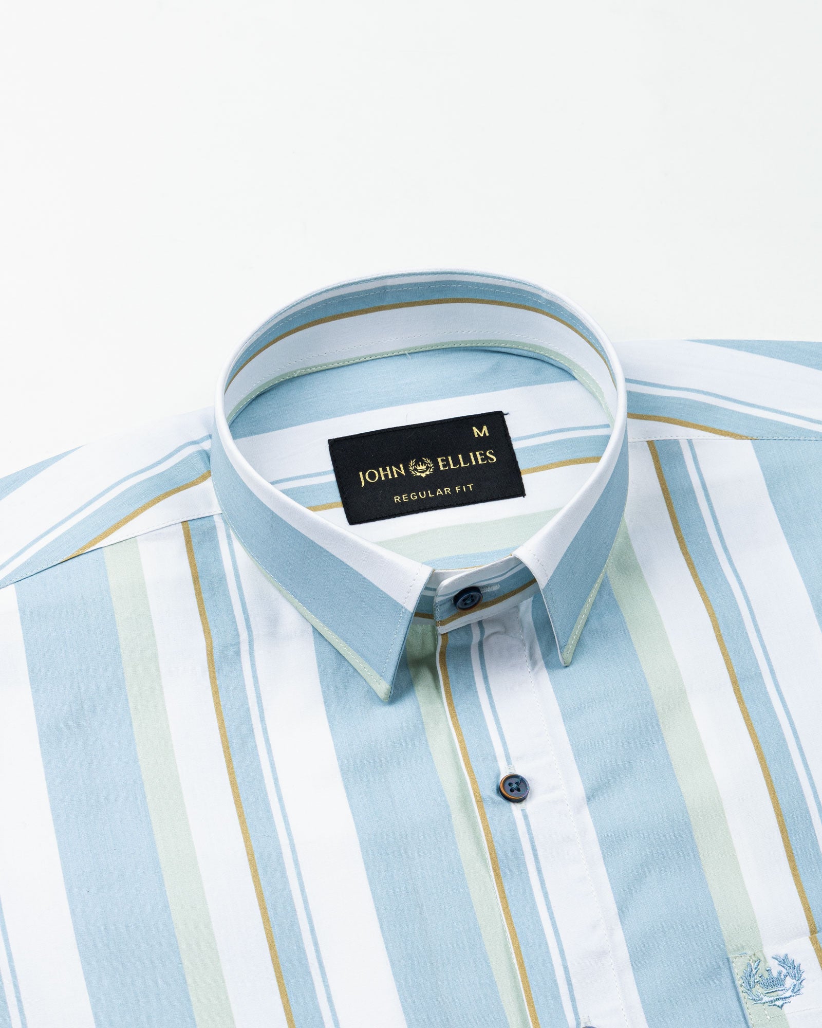 This shirt stands out with softly layered vertical stripes in steel blue, muted green, and crisp white, creating a balanced yet expressive visual rhythm. The classic collar and neatly defined cuffs keep the structure disciplined, while contrast buttons add a subtle edge, giving the design a refined confidence without feeling overstated.