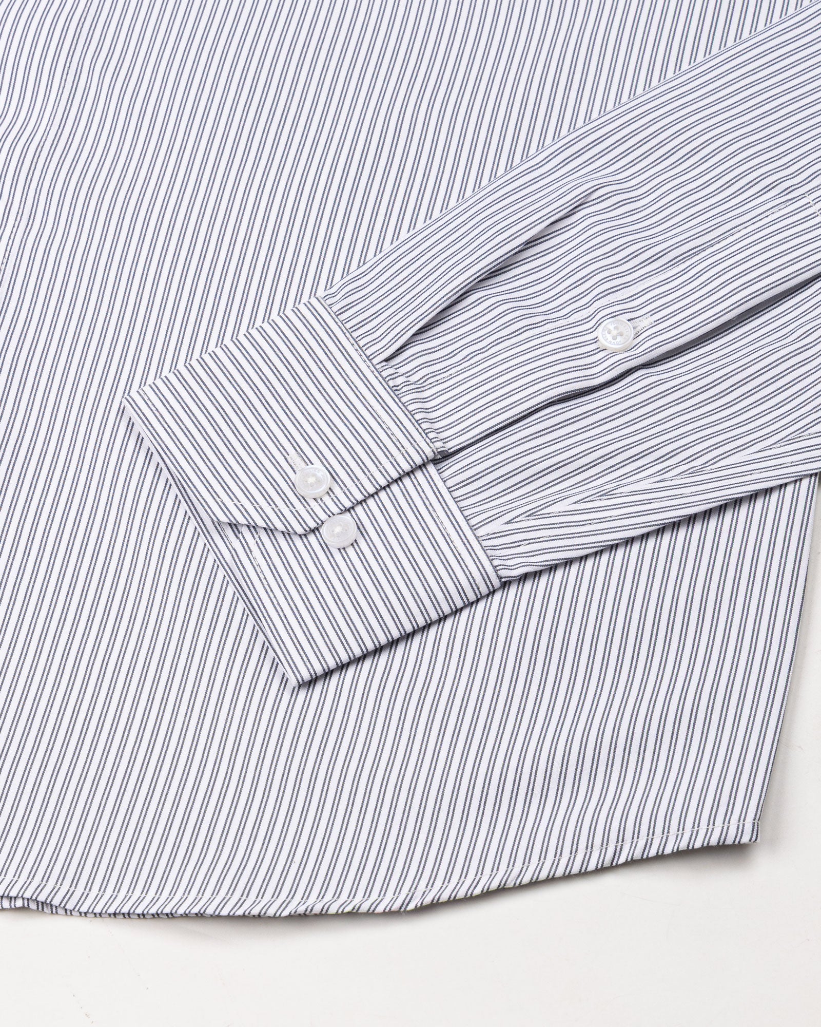 Defined by clean vertical stripes and a calm, balanced tone, this shirt delivers a sharp yet easygoing presence. The classic collar and structured silhouette keep it refined, while precise stitching, regular cuffs, and neatly aligned buttons bring a sense of control and maturity to the overall look. It’s the kind of shirt that feels composed the moment you put it on.