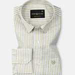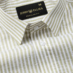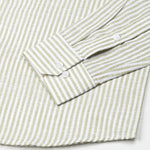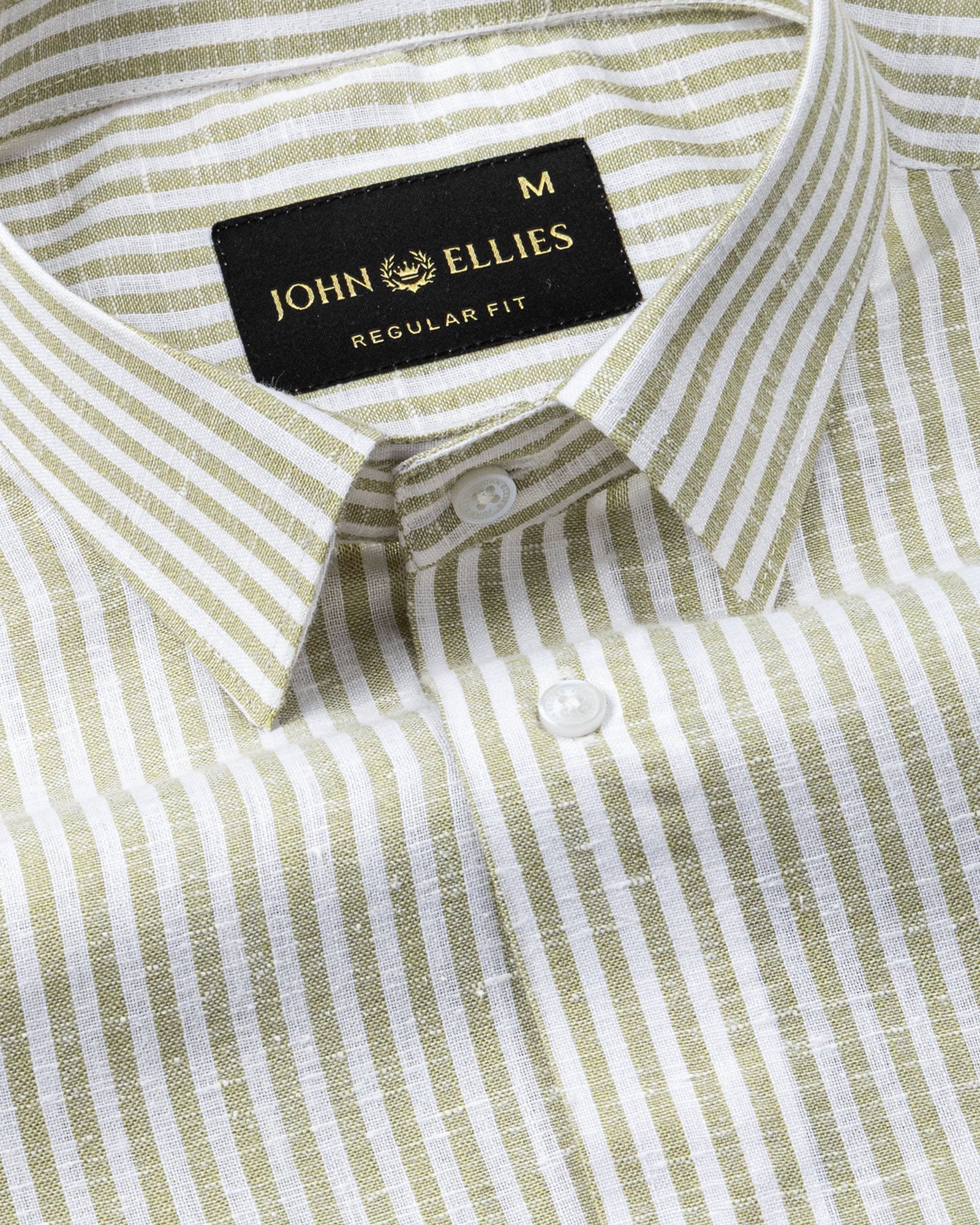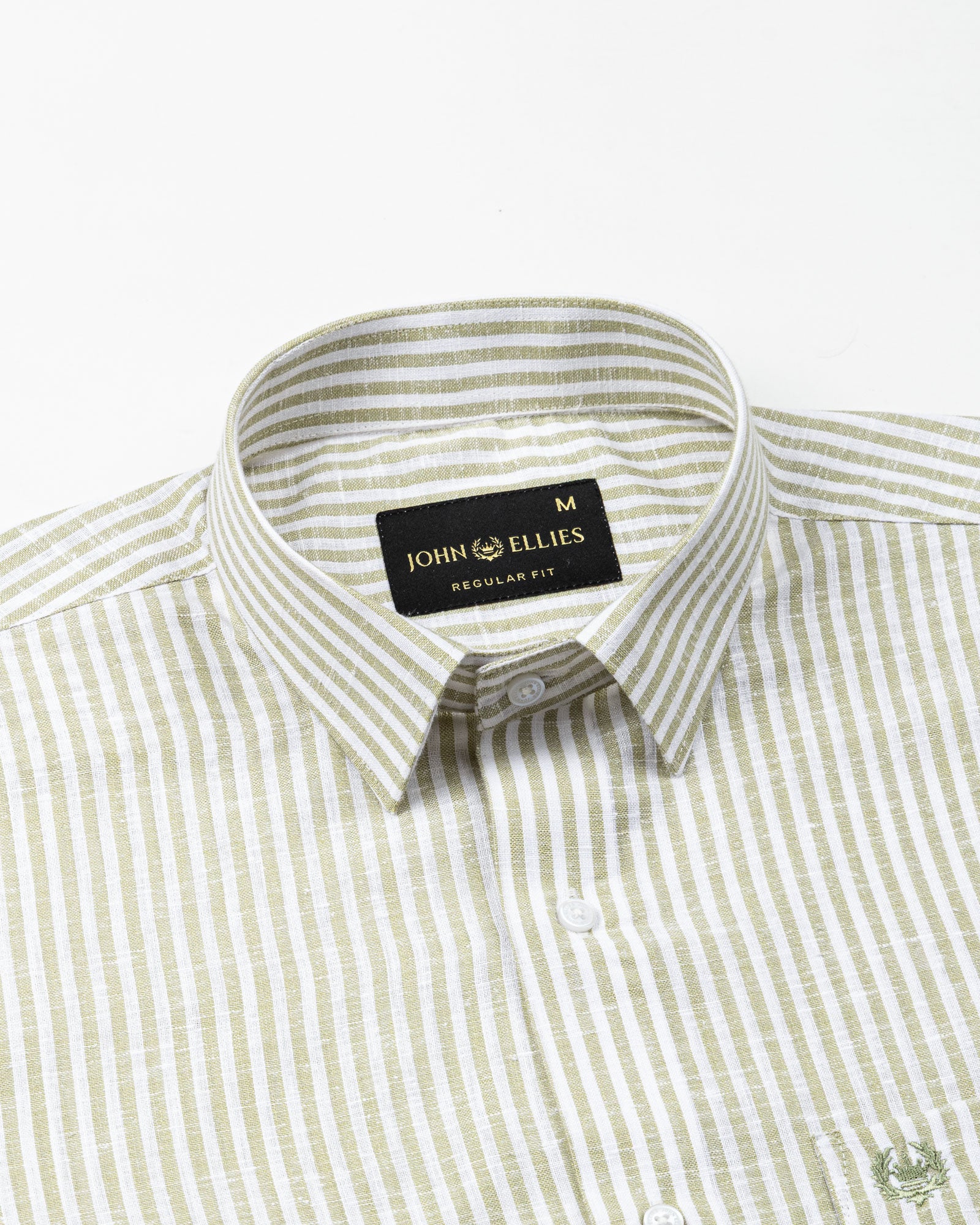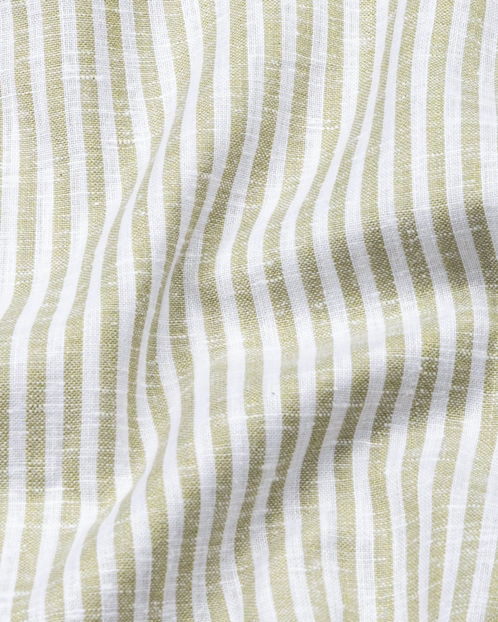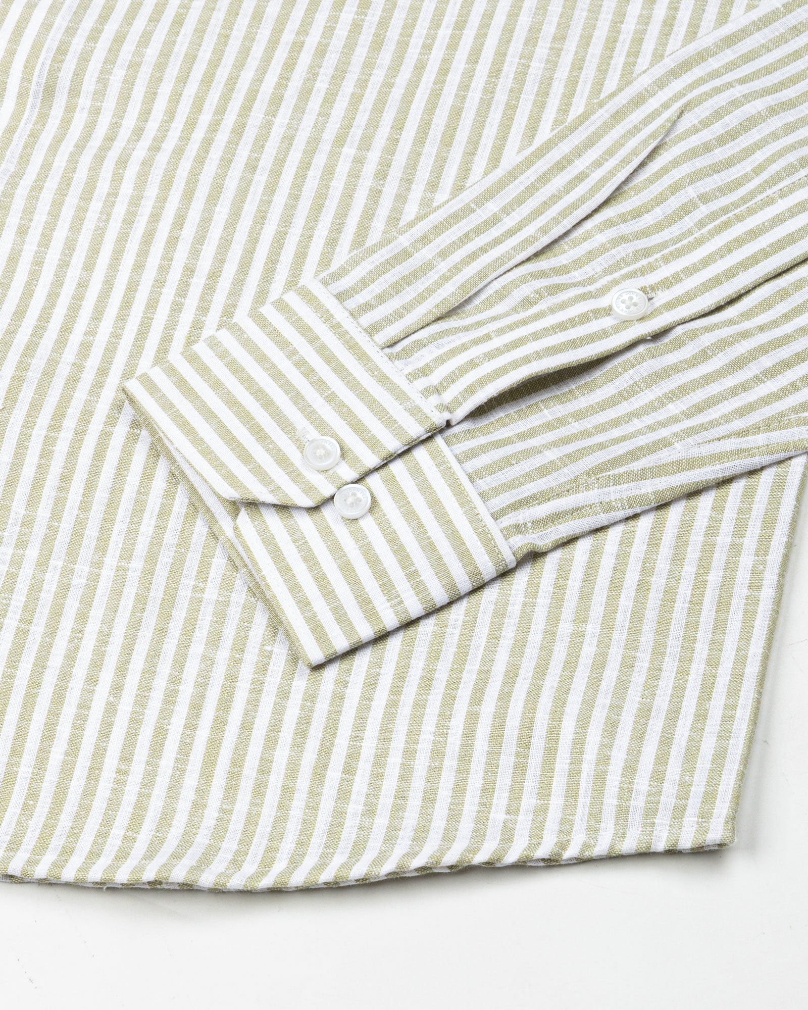 This striped linen shirt presents a refined, effortless look with a naturally relaxed character. The balanced stripe layout adds structure, while the well-shaped collar, clean front, and round cuffs create a smooth, uninterrupted silhouette. Finished with a stitchless appearance, it delivers a neat, modern profile ideal for warm-weather smart dressing.