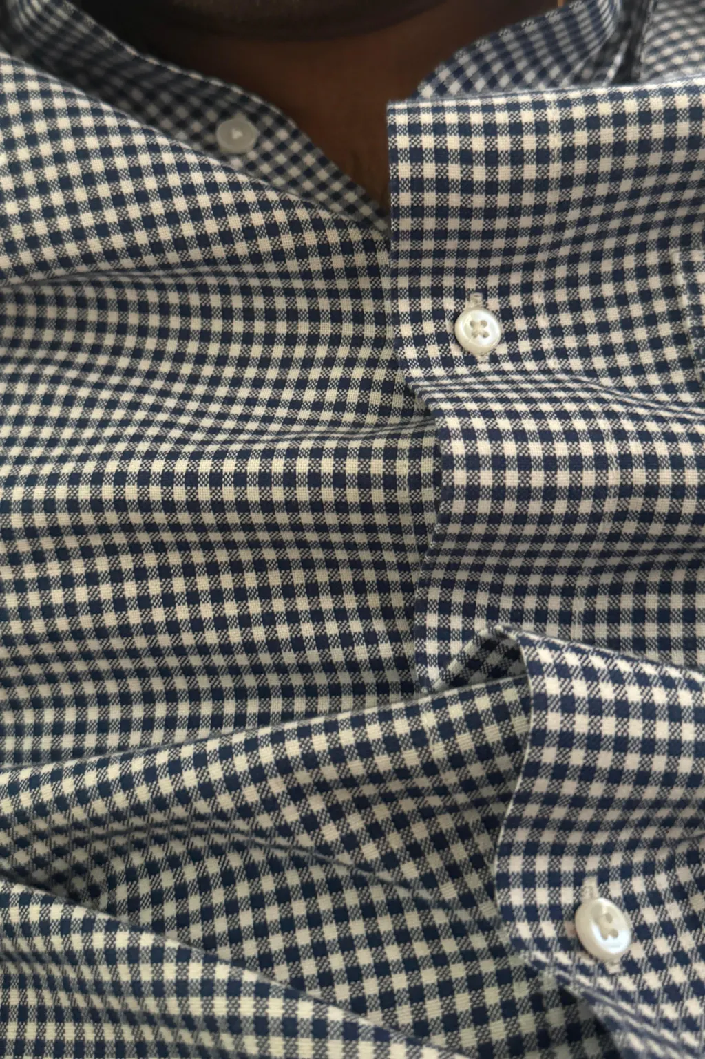 Our navy checked shirt is made from Gingham cotton. The high quality extra long fiber makes it possible to spin a finer and stronger yarn that creates some of the most luxurious fabrics in the world.