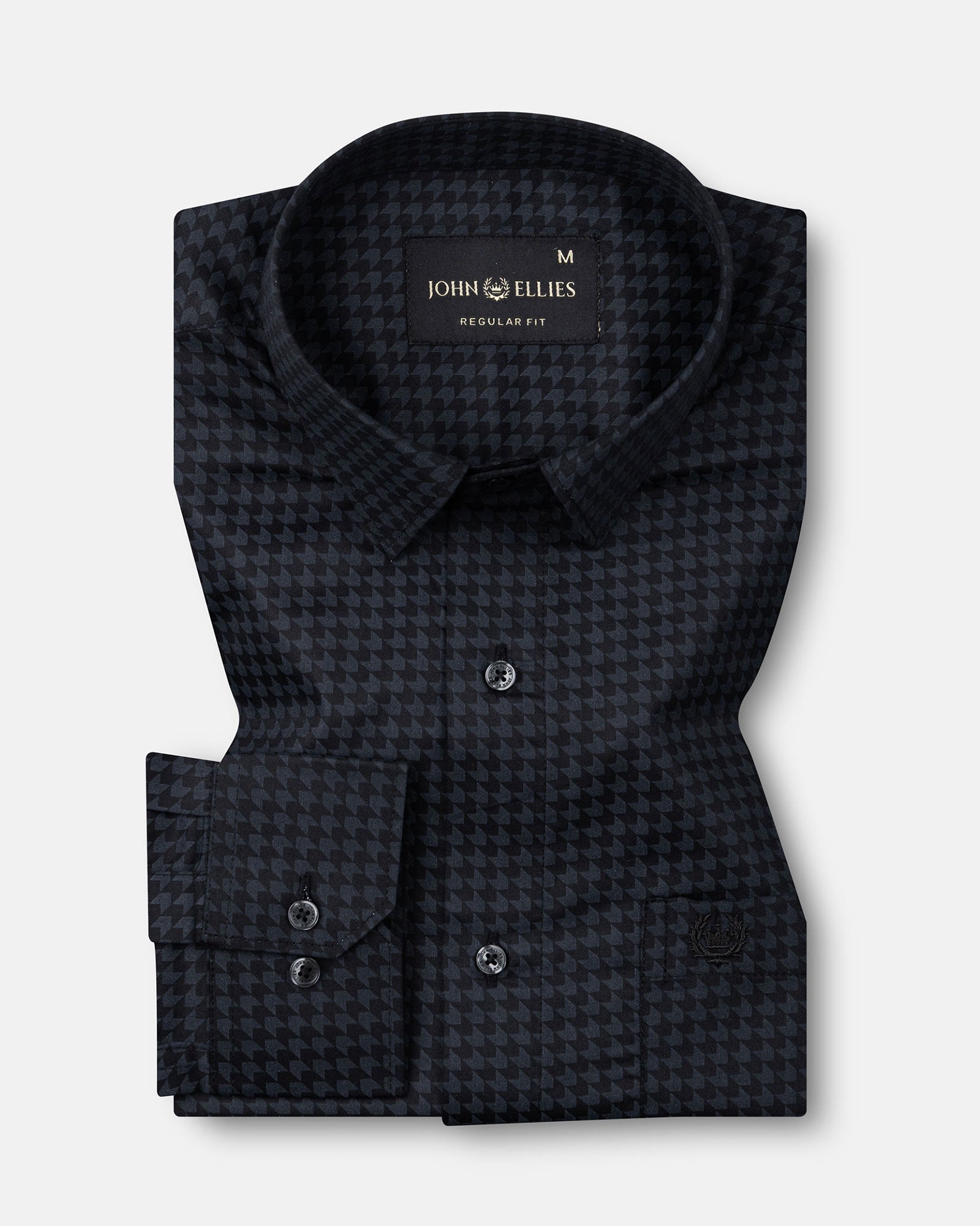 A deep black base layered with a sharp geometric pattern gives this shirt a strong, confident presence. The clean collar structure, neatly finished cuffs, and tonal buttons keep the look precise and controlled, while the subtle texture adds depth without noise.