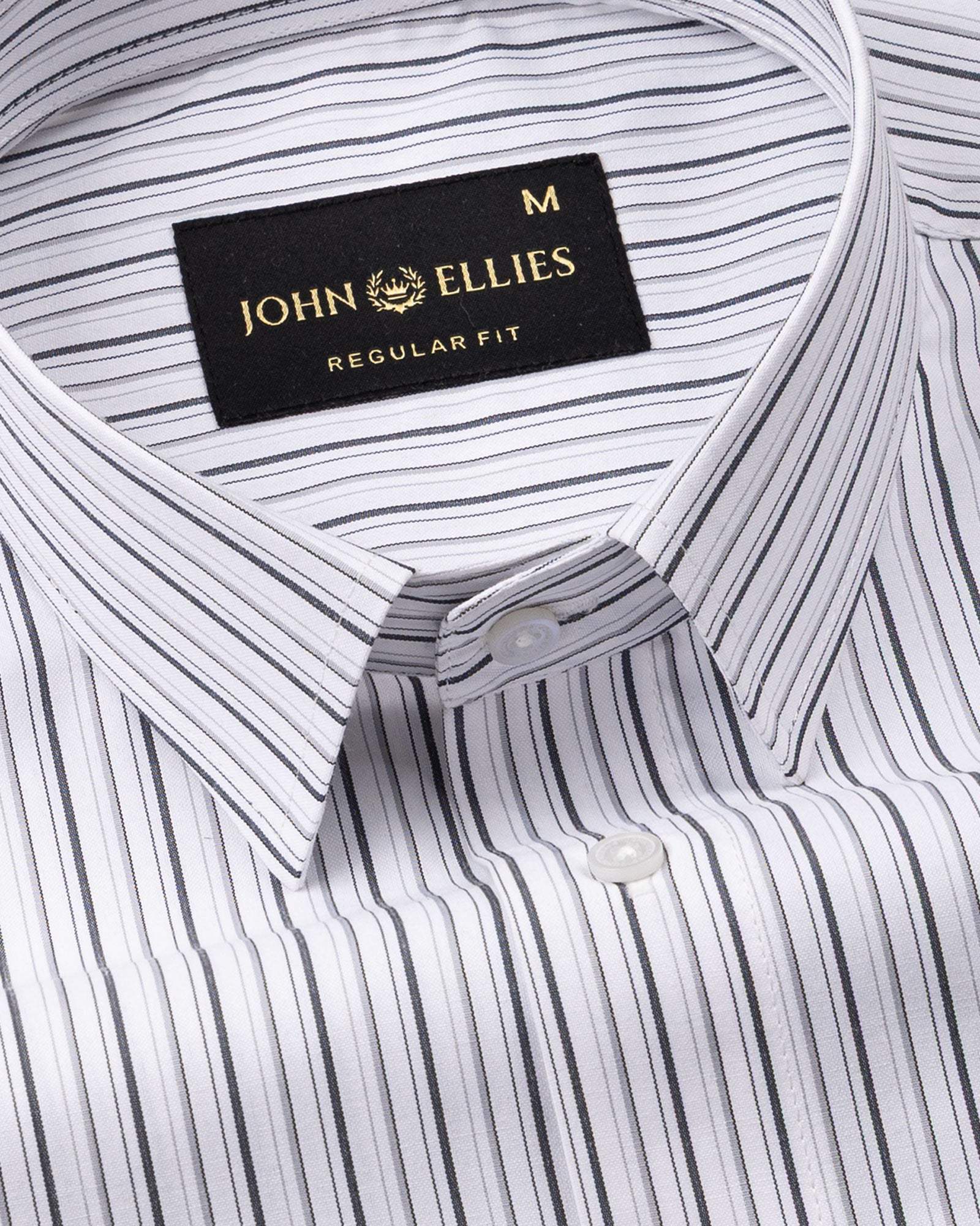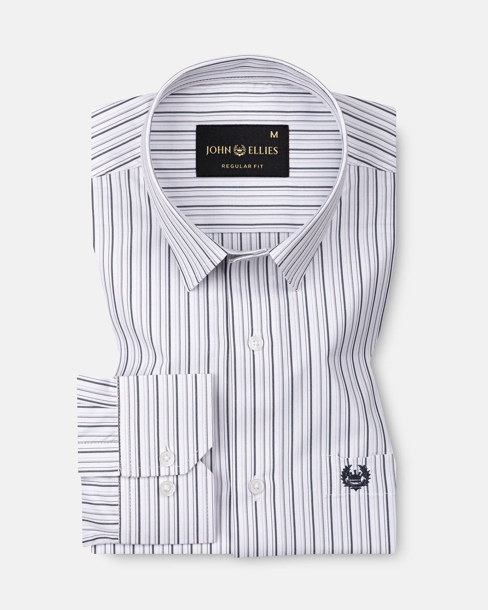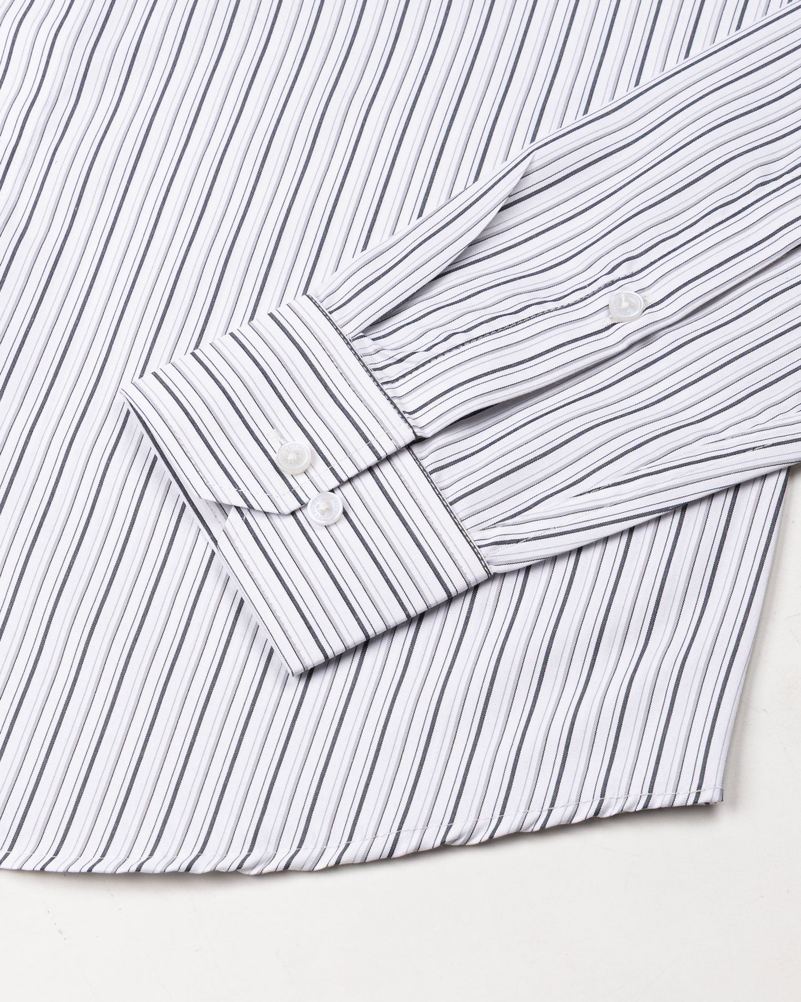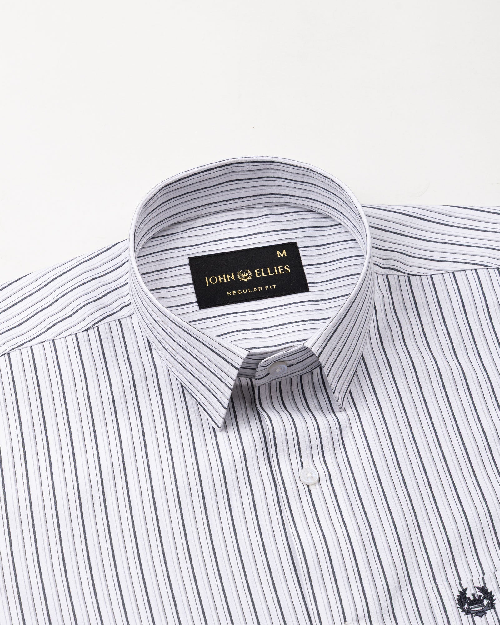 This grey striped shirt is designed with a classic spread collar and a clean front profile that keeps the look sharp and balanced. The vertical stripe placement adds structure without being loud, while the front pocket with tonal embroidery brings a subtle brand finish. Finished with white buttons and a regular fit.