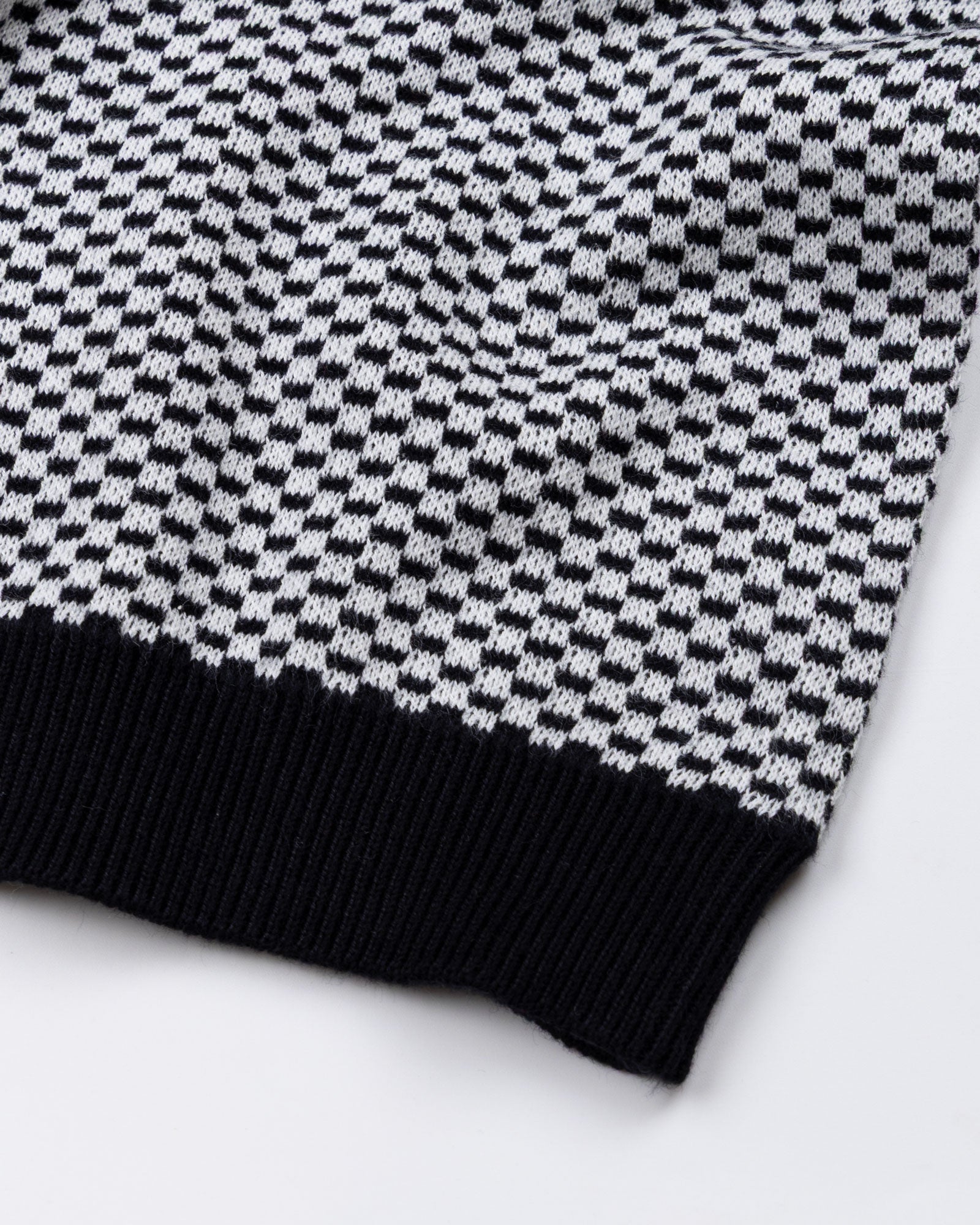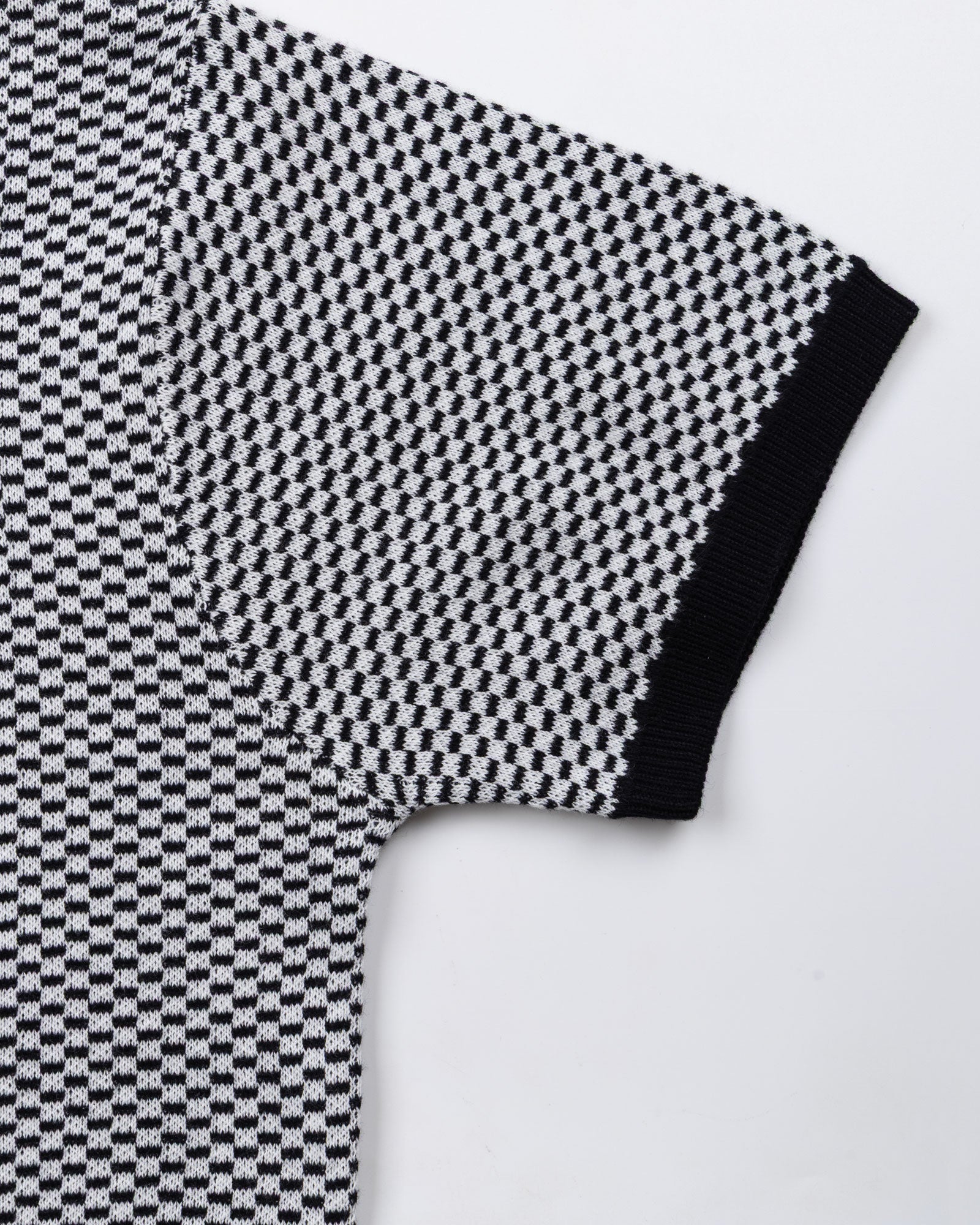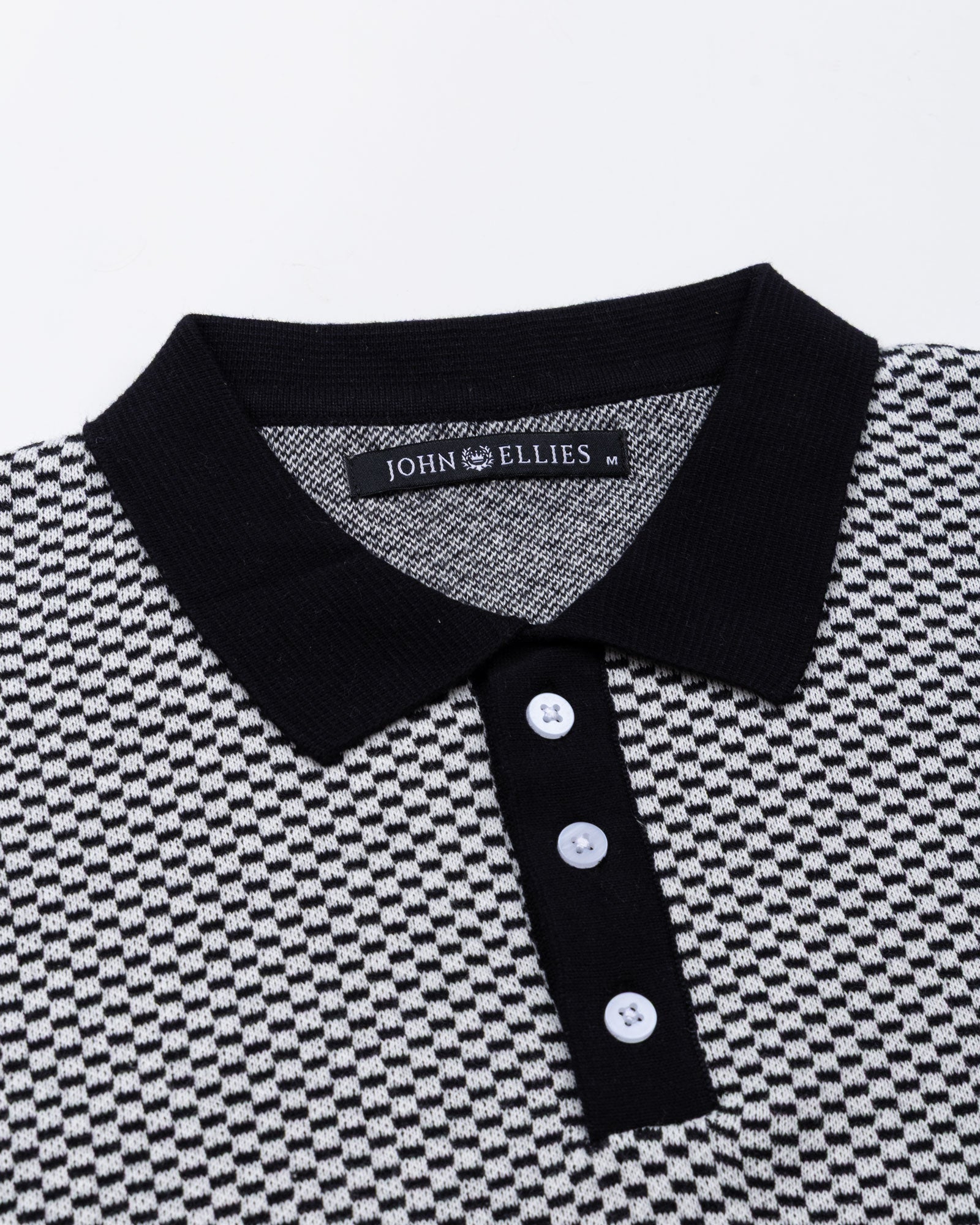 A striking patterned knit designed with a clean, structured collar and a bold contrast placket for added definition. Its intricate grid texture offers a refined yet modern appeal, making it an effortless statement piece for everyday style with a touch of sophistication.